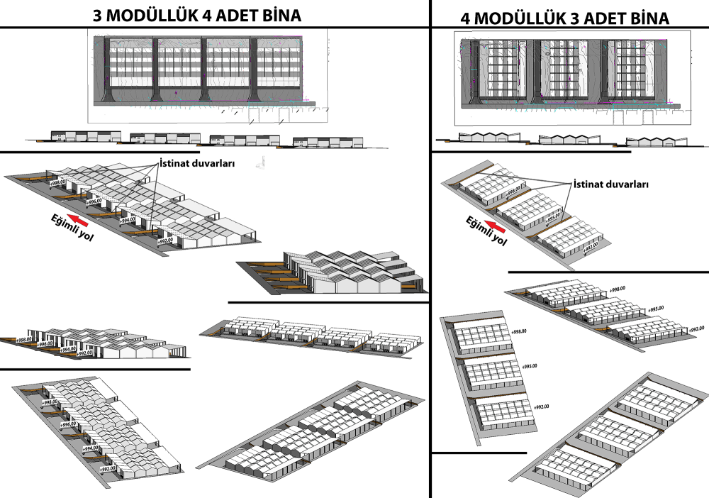 Karar verilen modül sayısı/taslak projenin ardından vaziyet planı başta olmak üzere; mimari, statik, mekanik ve elektrik projeleri çalışılmış ve finalize edilmiştir.